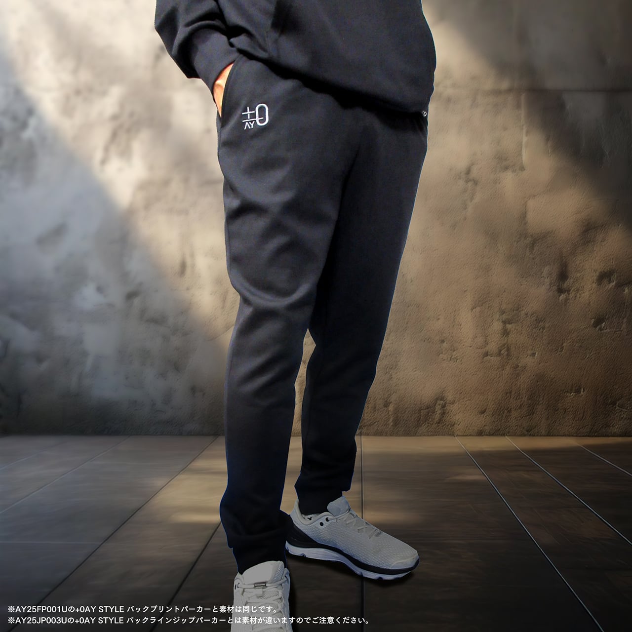 右サイドに+0AYのワンポイントロゴ刺繍。軽くてやわらかく、サラッとした肌触りの良い、8.8オンスのダンボールニット素材のストレッチ性のある生地を使用。アクティブなライフスタイルをサポートするために設計された動きやすさを追求した快適なフィット感のスタイリッシュなスウェットパンツ。吸汗速乾で、トレーニングや日常のカジュアルなコーディネートに最適なアイテムです。タイトなシルエットなのでワンサイズ大きめがおすすめです。コーディネートはAY25FP001Uの+0AY STYLE バックプリントパーカーで。