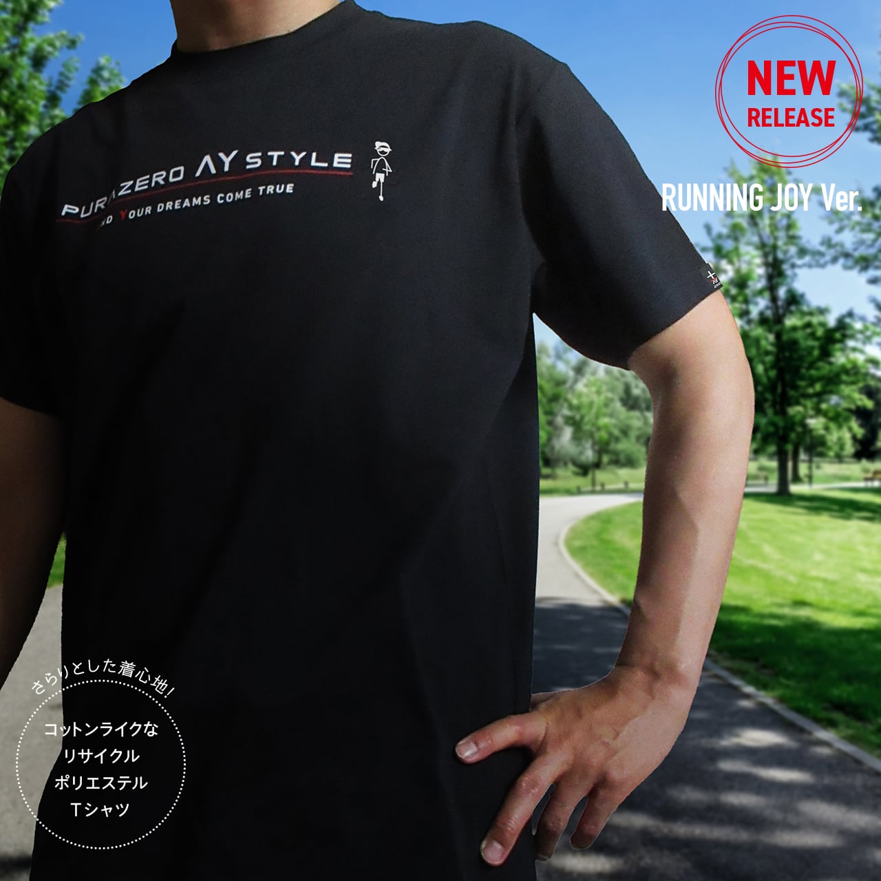 ランニング後の着替えもスタイリッシュに。フロントに「AND YOUR DREAMS COME TRUE」を掲げ、JOY君のランニングシーンをポップにデザイン。バックは右肩のランニングロゴをあしらいシンプルに。さらっとした着心地のいい、コットンライクドライTシャツ。ストレッチ性、速乾、UVカットと機能性に優れ、サステナブルな素材をベースにポリエステルながらコットンのような風合い。通気もよく、さらりと快適な着心地を保ちます。やや大きめのシルエットなので、ゆったり着こなせます。