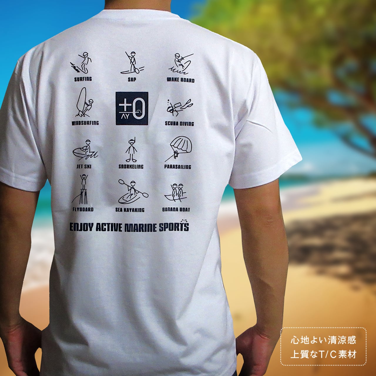バックに+0AYマリンロゴと楽しげなマリンアクティビティの線画イラストをデザイン。環境にも配慮したペットボトルリサイクル商品でこだわりを積み重ねた究極の1枚。素材や着心地にこだわった、永く着用いただける丈夫で上質なT/C素材のTシャツです。